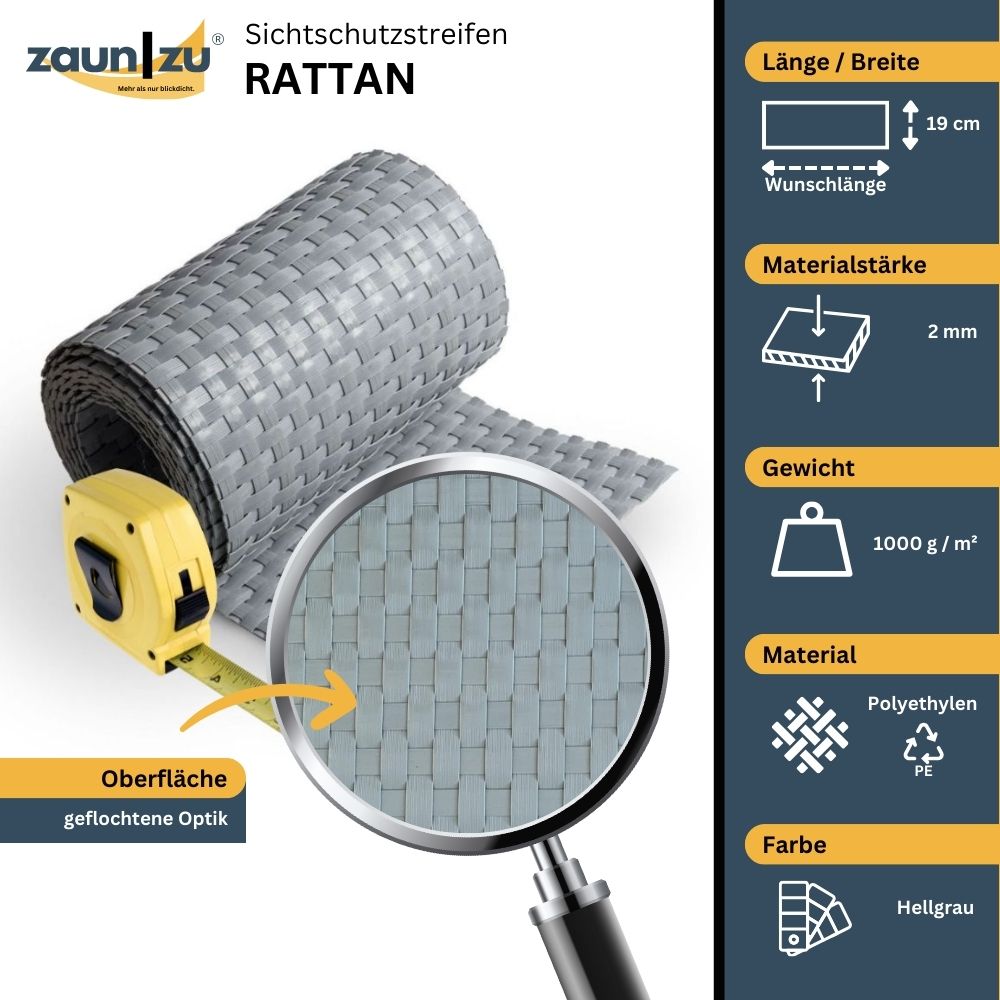 The zaun|zu RATTAN privacy strips are made of polyethylene (PE), also called PE rattan or technorattan in rattan look, and are available in various colors. This gives you the opportunity to design your garden fence exactly as you want it. You can either choose a uniform color or add accent stripes.
