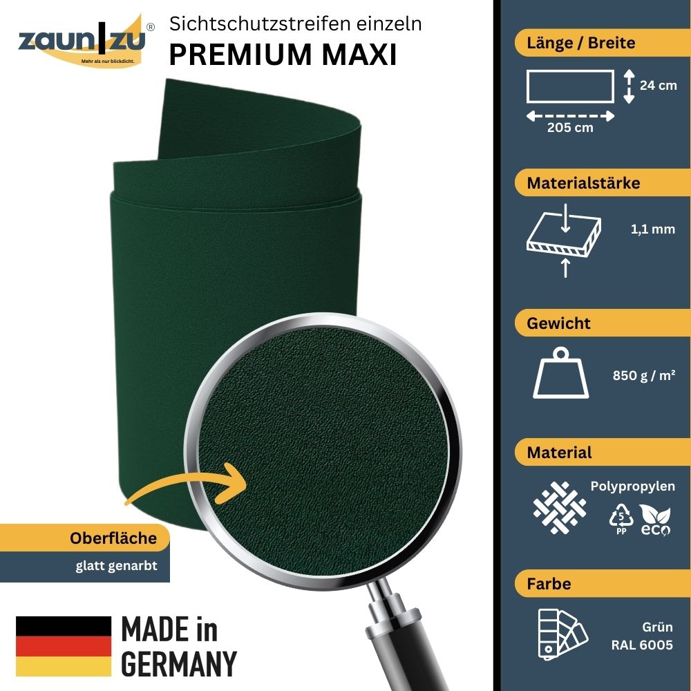 Die zaun|zu PREMIUM MAXI Sichtschutzstreifen - fertig zugeschnitten auf 2,05m: Viele Farben standardmäßig verfügbar