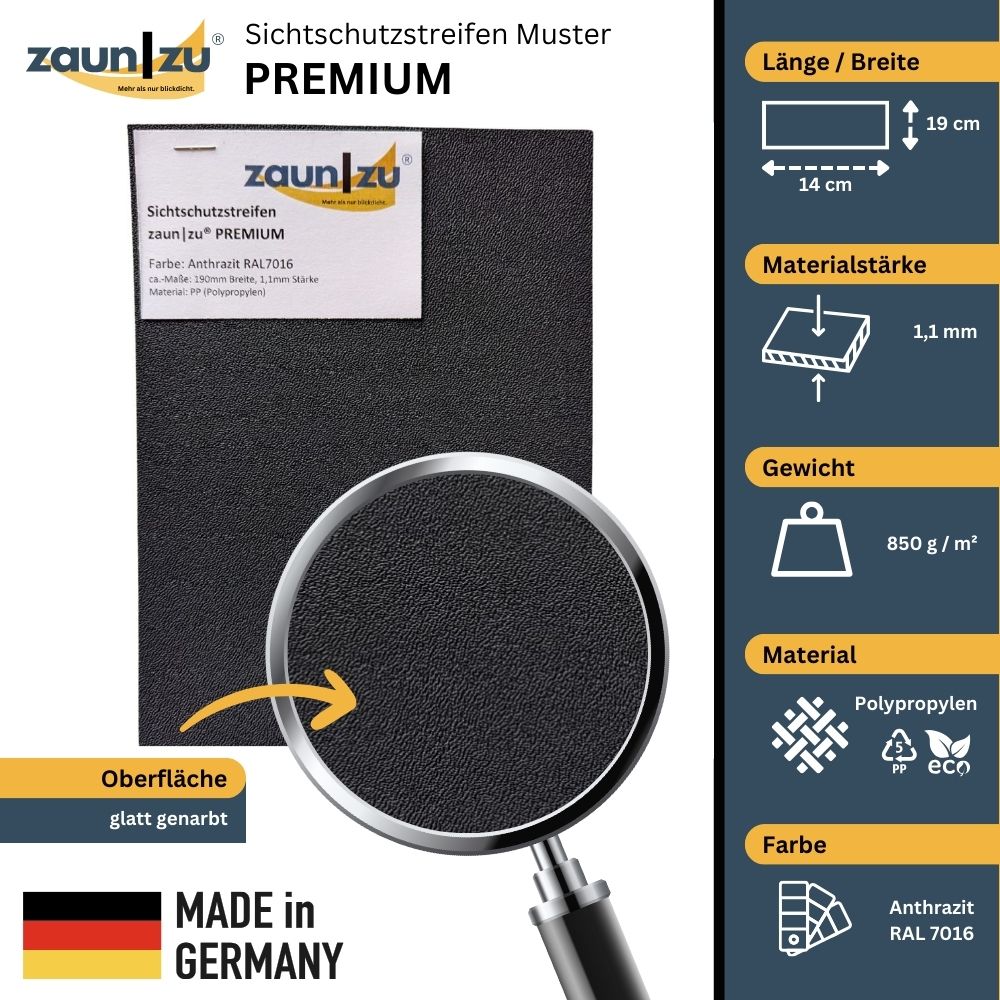 Entdecke den Sichtschutzstreifen zaun|zu PREMIUM! Mit diesem Musterstück erhältst du die Möglichkeit, dich vor der Bestellung von der Qualität des Sichtschutzes zu überzeugen. Unsere Sichtschutzstreifen sind speziell entwickelt, um deinen Zaun zu einem Blickfang zu machen und gleichzeitig für Privatsphäre und Schutz zu sorgen. Das Premium-Material PP (Polypropylen) ist UV-Beständig und witterungsfest, sodass du lange Freude daran haben wirst. Egal ob für den Garten, Balkon oder Terrasse – dieser Sichtschutzstreifen überzeugt mit seinem hochwertigen Design und einfacher Montage. Mach auch du deinen Zaun zum Highlight und bestelle vorab dein Sichtschutzstreifen zaun|zu PREMIUM Muster!