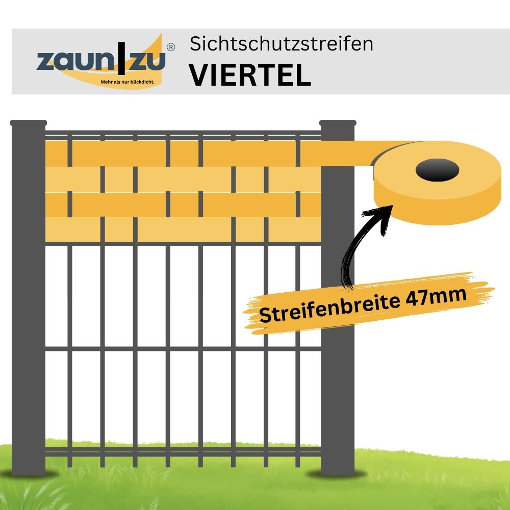 Bei dem Ergebnis lohnt sich der Mehraufwand: Unsere Sichtschutzstreifen zaun|zu PREMIUM VIERTEL lassen dir noch mehr Freiheiten bei der Gestaltung deines Sichtschutzes, um deinen Zaun in einen echten Hingucker zu verwandeln! Egal, ob du sie als Akzentstreifen in Kombination mit den "normalen" PREMIUM Zaunstreifen verwendest oder den gesamten Doppelstabmattenzaun damit ausstattest - der Sichtschutz mit viertelbreiten Streifen ist ein Blickfang für jeden Zaun.